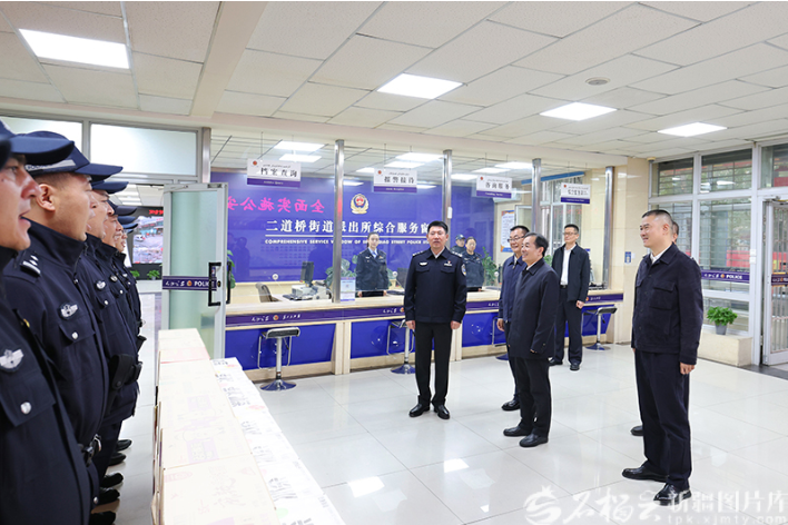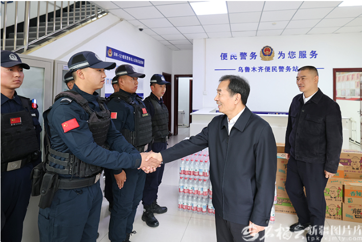 10月5日,自治区党委书记、兵团党委第一书记、第一政委陈小江在乌鲁木齐市公安局二道桥街道派出所,看望慰问基层政法干警,向节日期间坚守岗位的一线干部职工致以亲切问候。石榴云/新疆日报记者崔志坚摄
