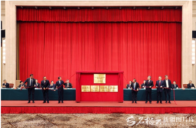 11月17日,自治区党委书记陈小江,自治区党委副书记、自治区主席艾尔肯·吐尼亚孜和有关院士、专家共同为干旱区生态安全与可持续发展全国重点实验室和新疆能源化工实验室、丝路水实验室、昆仑智能装备实验室、新疆天山科技创新院揭牌。石榴云/新疆日报记者崔志坚摄