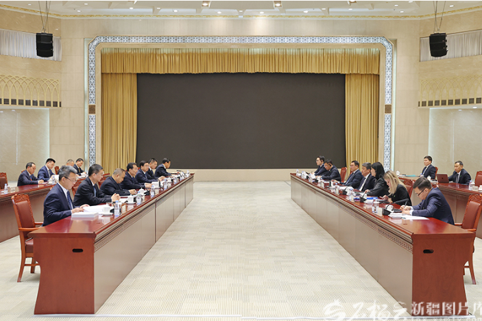 11月6日,自治区党委书记陈小江、自治区主席艾尔肯·吐尼亚孜在乌鲁木齐会见吉尔吉斯斯坦副总理托罗巴耶夫。石榴云/新疆日报记者崔志坚摄