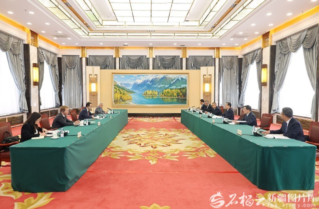 11月6日,自治区党委书记陈小江、自治区主席艾尔肯·吐尼亚孜在乌鲁木齐会见土耳其驻华大使于纳尔。石榴云/新疆日报记者崔志坚摄