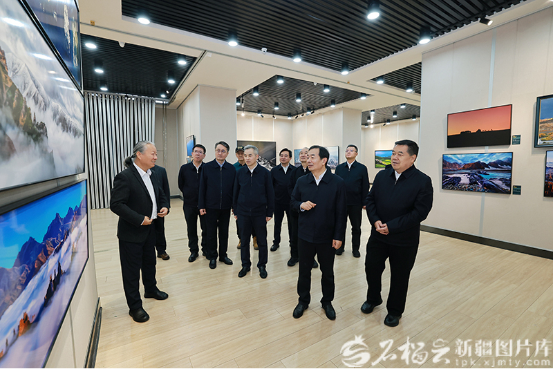 1月9日,自治区党委书记陈小江在自治区文联,参观新疆风光摄影展并与摄影师亲切交流。石榴云/新疆日报记者崔志坚摄