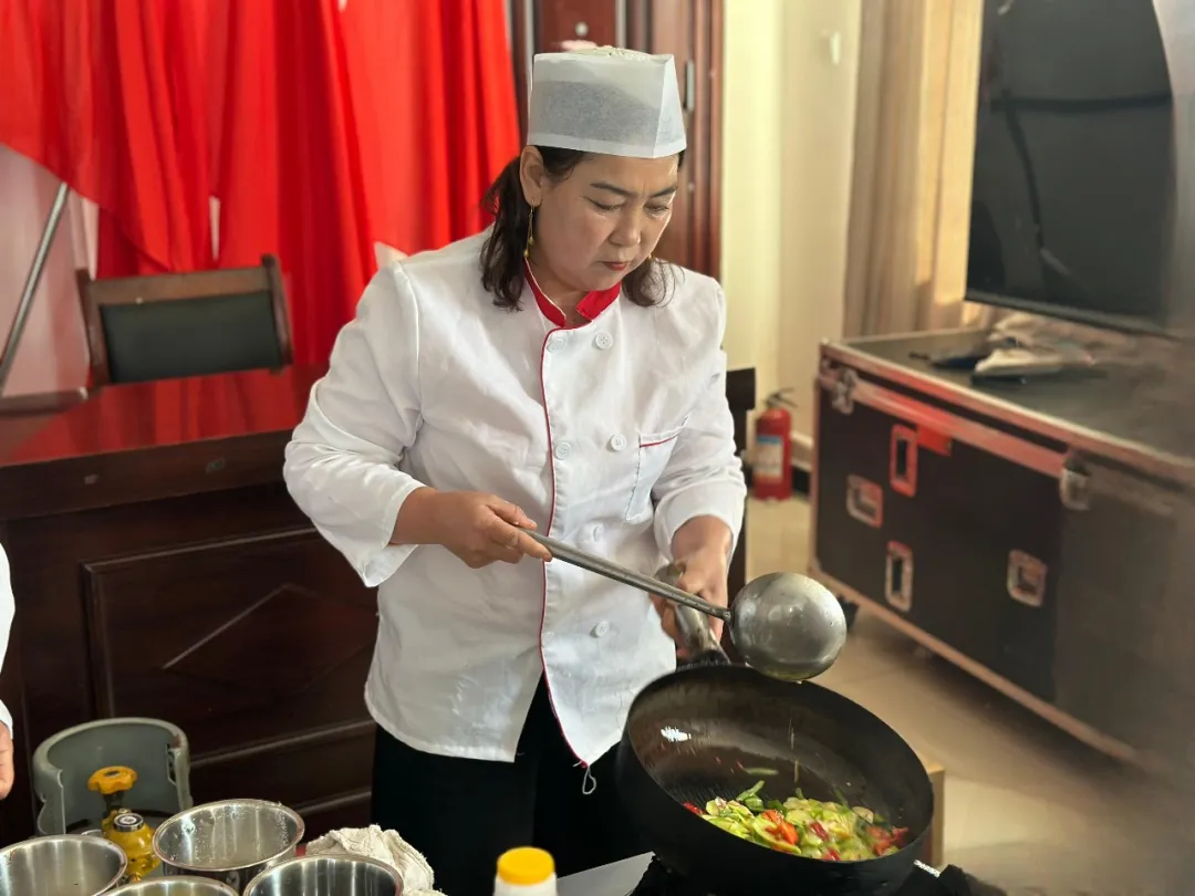 比赛现场,9支参赛队伍早早来到指定区域,食材预处理、调料搭配、准备工作有条不紊。有的手持菜刀精准切配,有的掌勺翻炒,火候把控恰到好处,有的专注摆盘,普通的蔬菜经巧手点缀,瞬间变成色香味俱全的美味佳肴。“通过技能培训学到了烹饪技巧,今后想依托所学技能开办农家乐,靠手艺增收致富。”村民地力奴尔·达吾列提汉开心地分享着自己的打算。