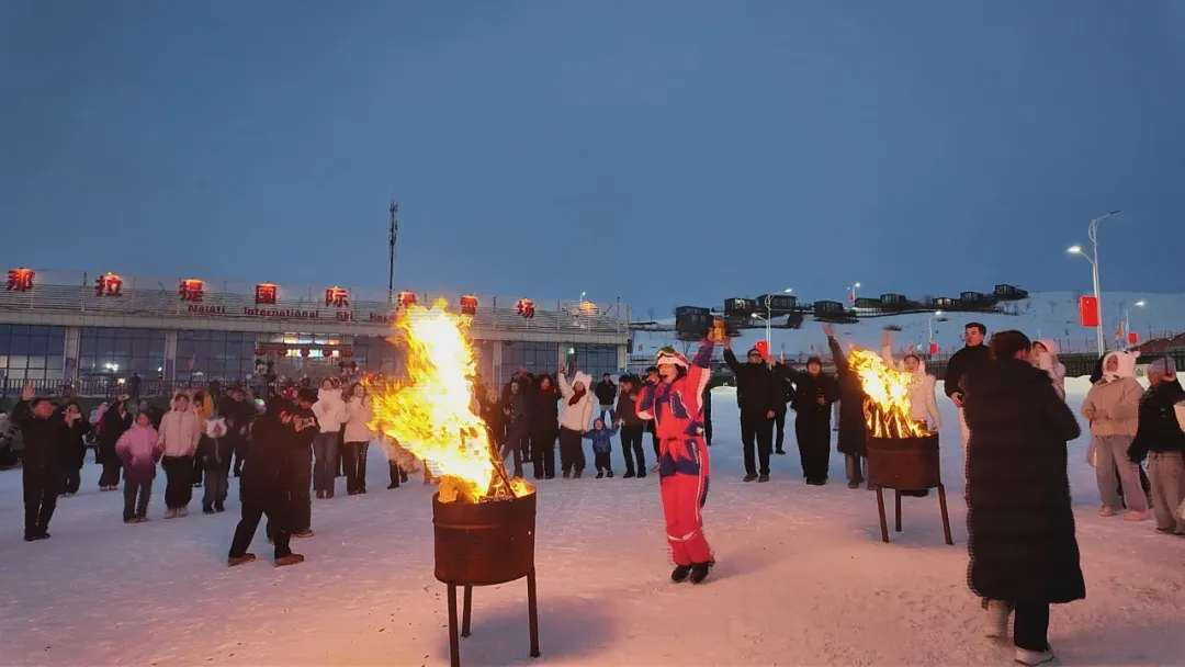 白天赛事燃情逐雪,夜晚狂欢持续升温。当天19点,冰雪狂欢夜正式拉开帷幕,现场灯光璀璨、气氛热烈。活动精心还打造了特色雪地火锅宴,热气腾腾的美食与冰天雪地形成鲜明对比,让游客在畅享冰雪乐趣的同时,感受舌尖上的温暖与美味。随后,狂欢环节亮点纷呈,专业DJ现场打碟,动感节奏点燃全场氛围,专业歌舞团带来精彩文艺表演,新疆特色与现代活力相互交融。热闹的篝火互动环节中,游客们手拉手围着篝火欢歌、载歌载舞,沉浸式感受雪夜狂欢的独特魅力,现场还穿插多轮幸运抽奖,惊喜不断、欢乐不停。