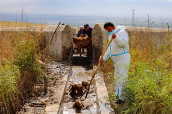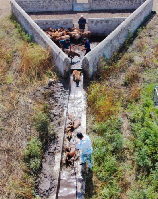 牛羊顺利转场“回家”后,一场保障牲畜健康的“特殊护理”——秋季药浴也随即同步展开。在新源县则克台镇铁木里克村的一处集中药浴点,工作人员提前根据牲畜数量和健康需求,精准调配好具有驱虫、杀菌功效的药液,确保药液浓度适宜、效果达标。牧民们则相互配合,有序地将牛羊赶入药浴池,让每一头牲畜都能充分浸泡在药液中。