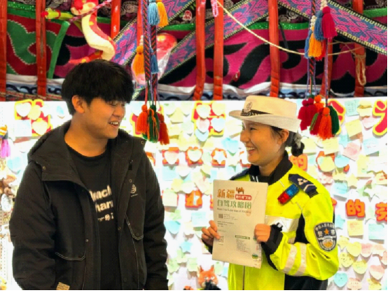活动现场,交警们化身“安全向导”,手持宣传手册穿梭在游客中,结合景区道路弯多、牛羊穿行等特点,用通俗易懂的语言向游客讲解山路驾驶技巧、避让牲畜注意事项。从景区入口的车流引导,到观景平台的安全提示,交警们全程跟进,耐心解答游客关于景区路况、行车路线等疑问。