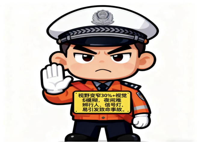 2、视野变窄30%+视觉模糊,夜间难辨行人、信号灯,易引发致命事故;