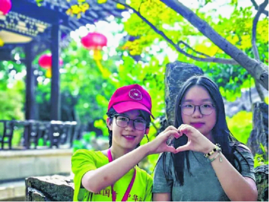 参加“苏韵伊情·扬新同行”小石榴籽夏令营活动的艾迪娜·周木洒(左)和“书信朋友”沈希媛在扬州相见(7月21日摄)。□图片由扬州工作组提供