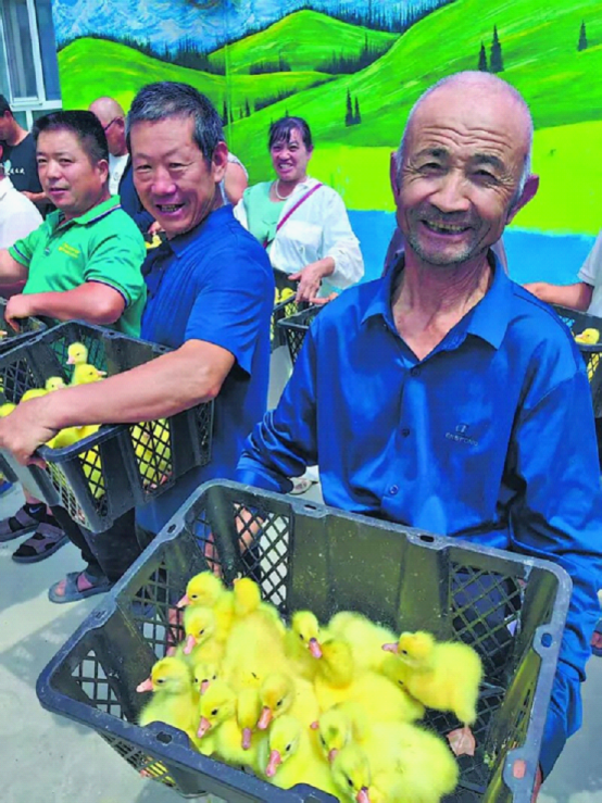 在新源县喀拉布拉镇,扬州援疆三花鹅林下养殖推广援助项目鹅苗发放现场热闹非凡,50名农牧民免费领取近万只三花鹅苗(7月8日摄)。□图片由扬州工作组提供