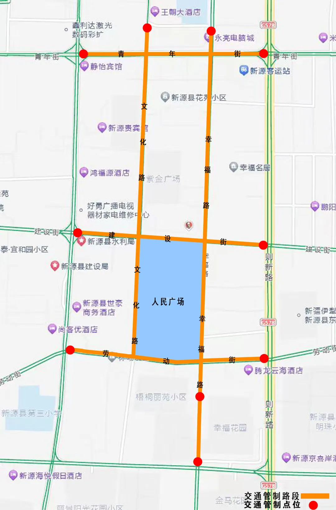 1.社火展演管控路段:青年街、建设街、劳动街、文化路、幸福路部分路段