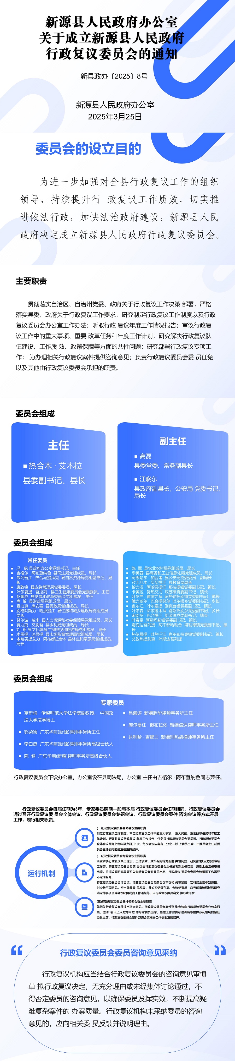 成立行政复议委员会,是新源县政府推进法治建设、护老百姓权益的重要举措。通过专业、高效的工作机制,让老百姓在遇到行政争议时,有一个更可靠、更公平的解决渠道。如果有相关问题,可以咨询县司法局或行政复议委员会办公室。