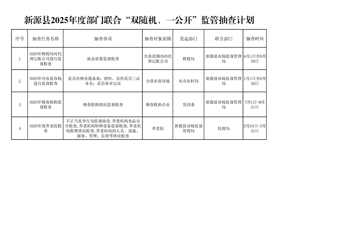 新源县2025年度部门联合“双随机、一公开”监管抽查计划