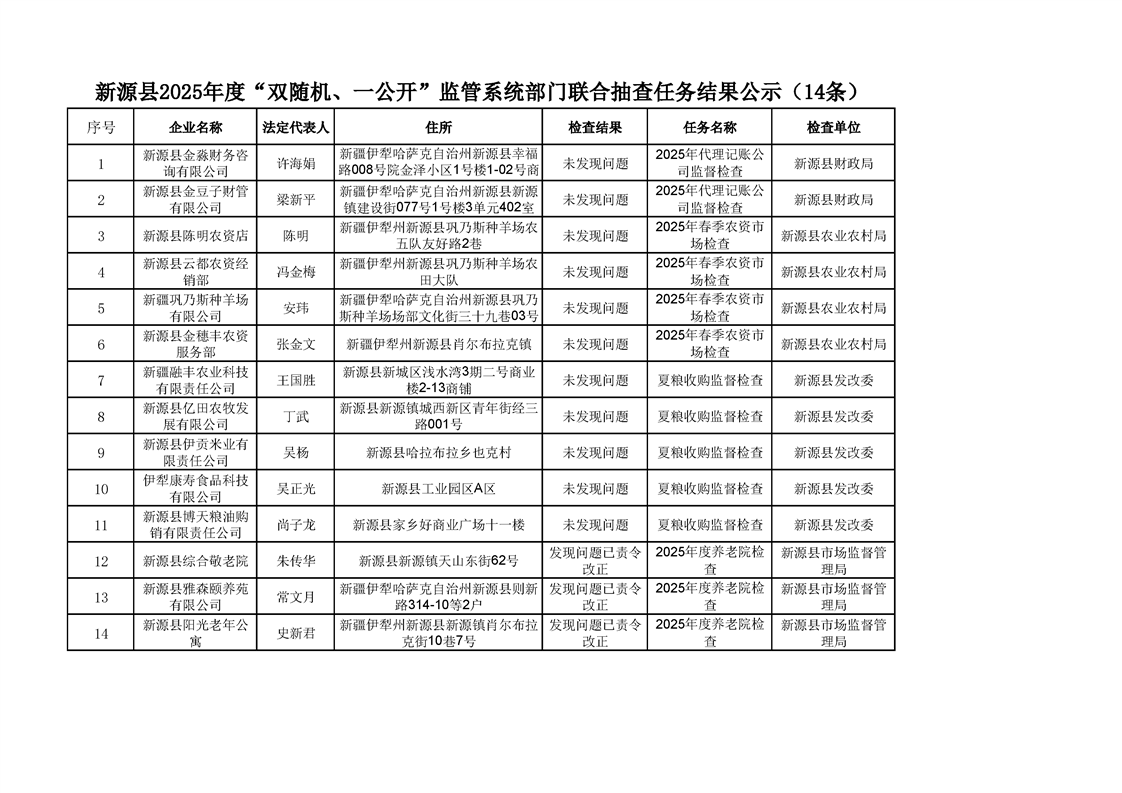 新源县2025年度“双随机、一公开”监管系统部门联合抽查任务结果公示