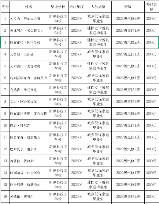 根据求职创业补贴申请工作流程,现对新源县技工学校16人预享受1.6万元求职创业补贴资金人员情况进行公示。