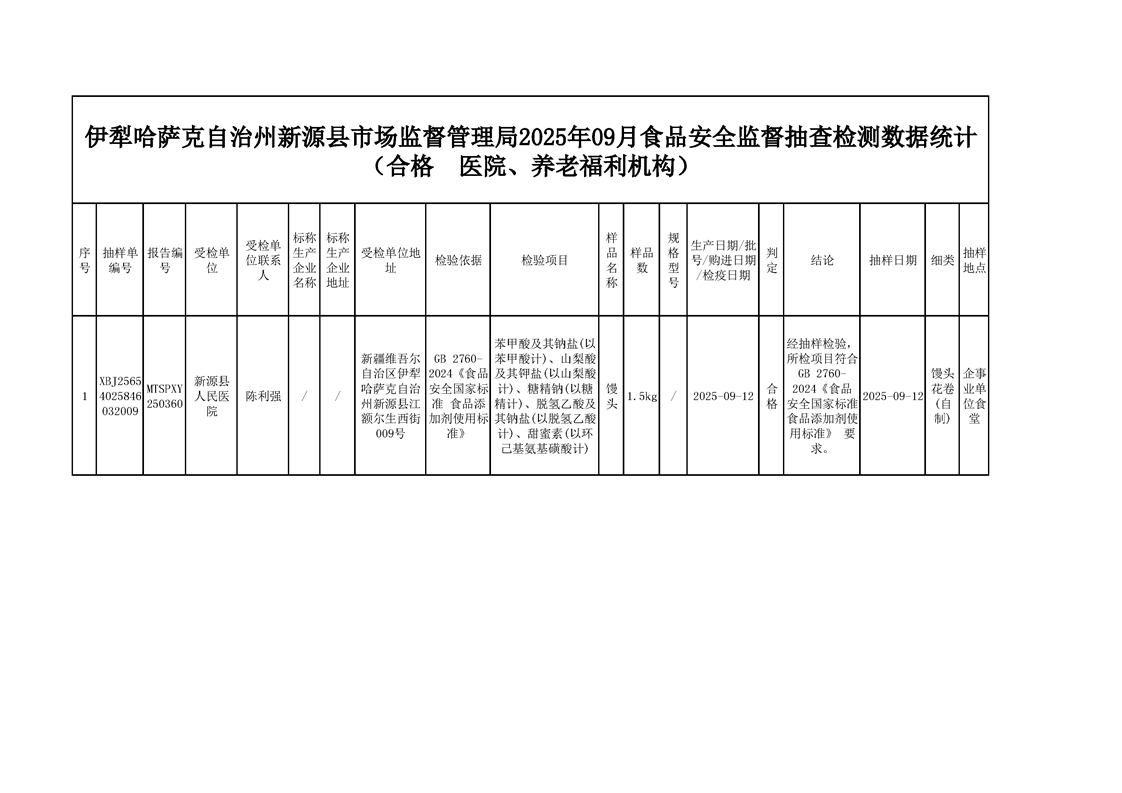 伊犁哈萨克自治州新源县市场监督管理局2025年09月食品安全监督抽查检测数据统计(合格 医院、养老福利机构)