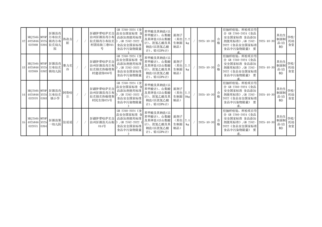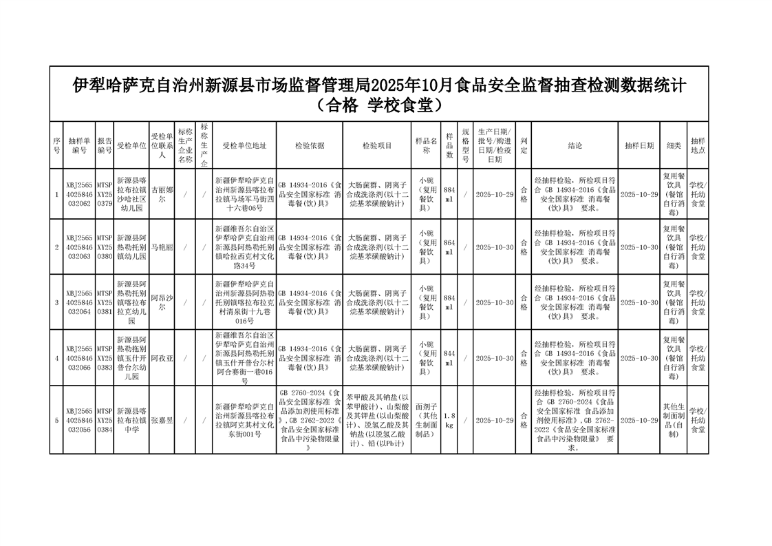 伊犁哈萨克自治州新源县市场监督管理局2025年10月食品安全监督抽查检测数据统计(合格 学校食堂)