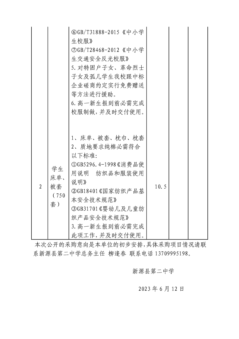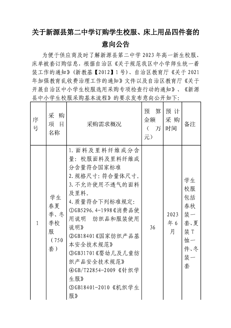 关于新源县第二中学订购学生校服、床上用品四件套的意向公告