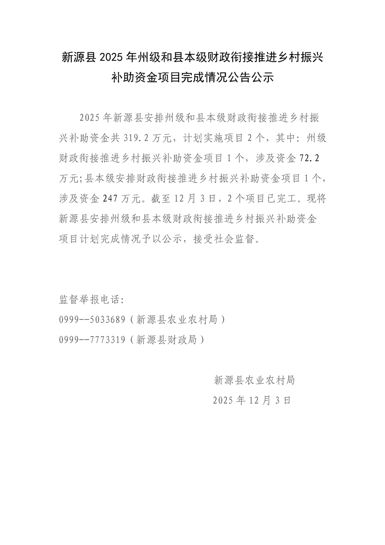 新源县2025年州级和县本级财政衔接推进乡村振兴补助资金项目完成情况公告公示