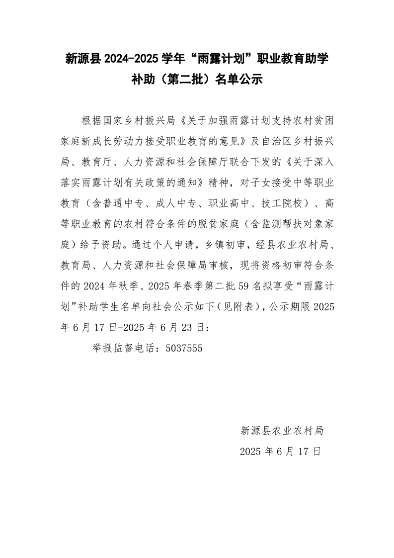 新源县2024-2025学年“雨露计划”职业教育助学补助(第二批)名单公示