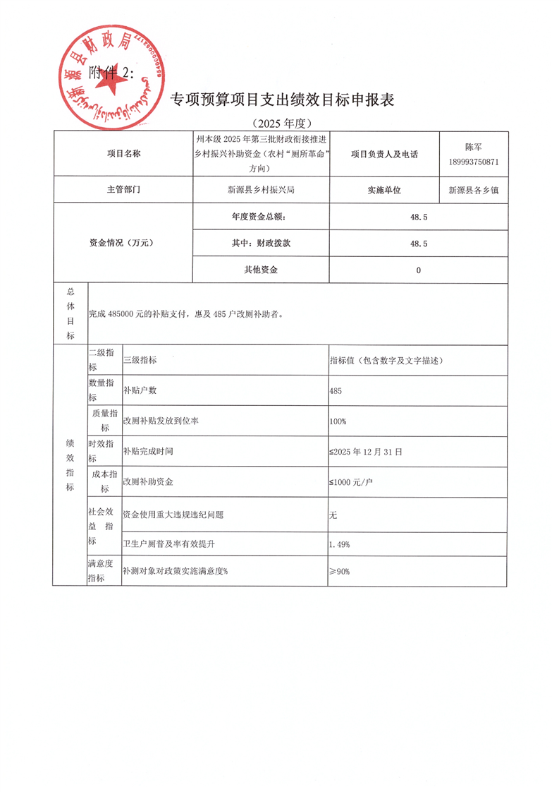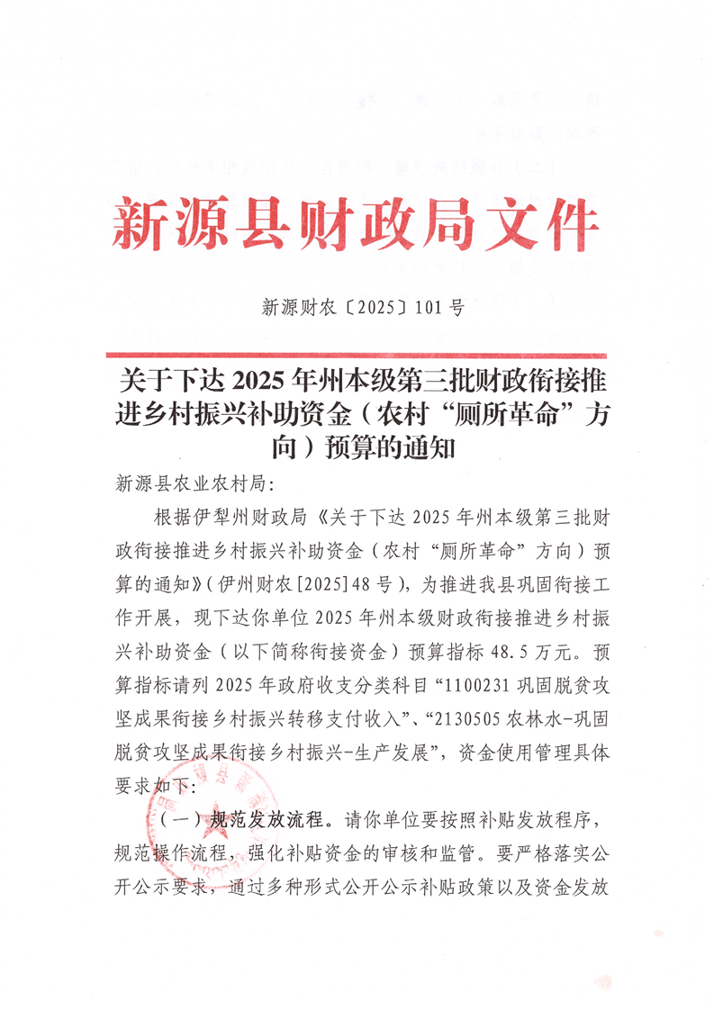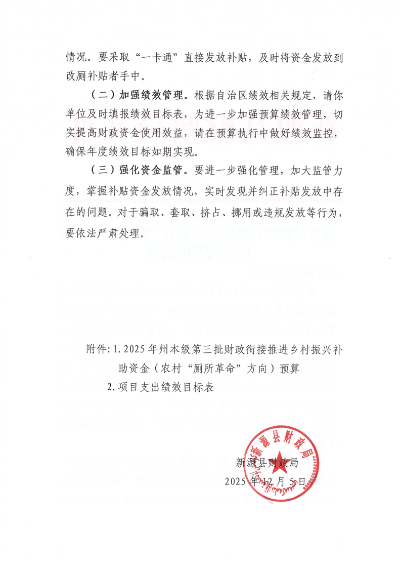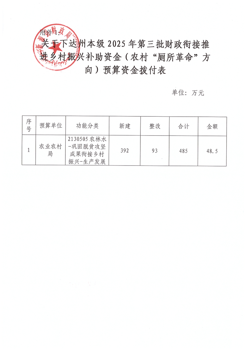 关于下达2025年州本级第三批财政衔接推进乡村振兴补助资金(农村“厕所革命”方向)预算的通知