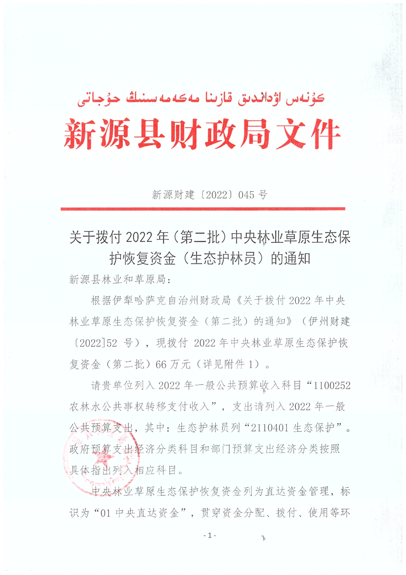 新源财建〔2022〕045号 关于拨付2022年(第二批)中央林业草原生态保护恢复资金(生态护林员)的通知