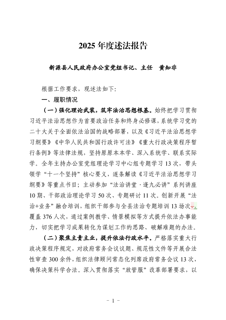 2025年度述法报告(新源县人民政府办公室党组书记、主任 黄知非)