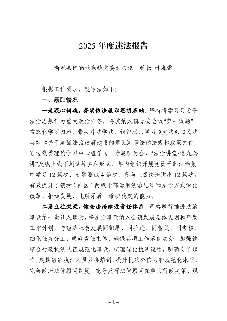 2025年度述法报告(阿勒玛勒镇党委副书记、镇长 叶春雷)
