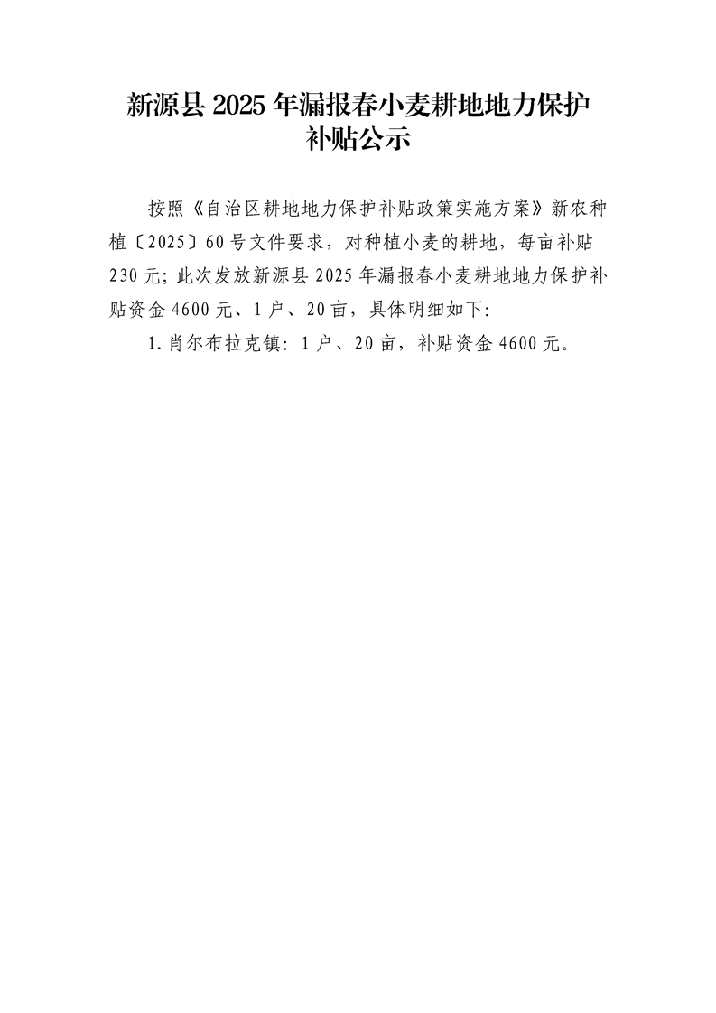 新源县2025年漏报春小麦耕地地力保护补贴公示