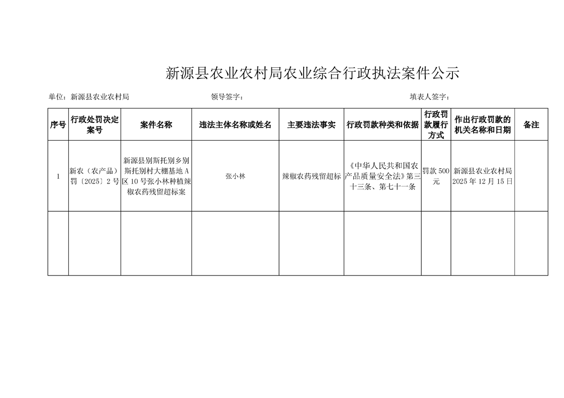 新源县农业农村局农业综合行政执法案件公示(辣椒农药残留超标)