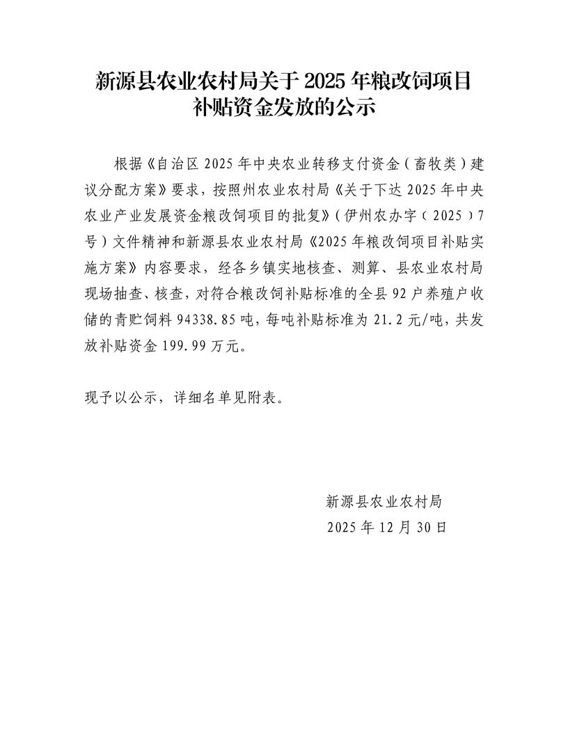 新源县农业农村局关于2025年粮改饲项目补贴资金发放的公示