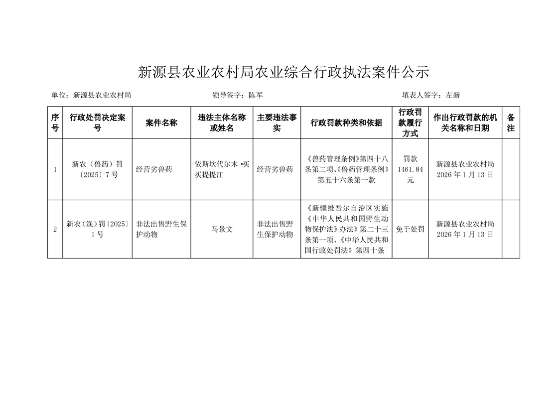 新源县农业农村局农业综合行政执法案件公示
