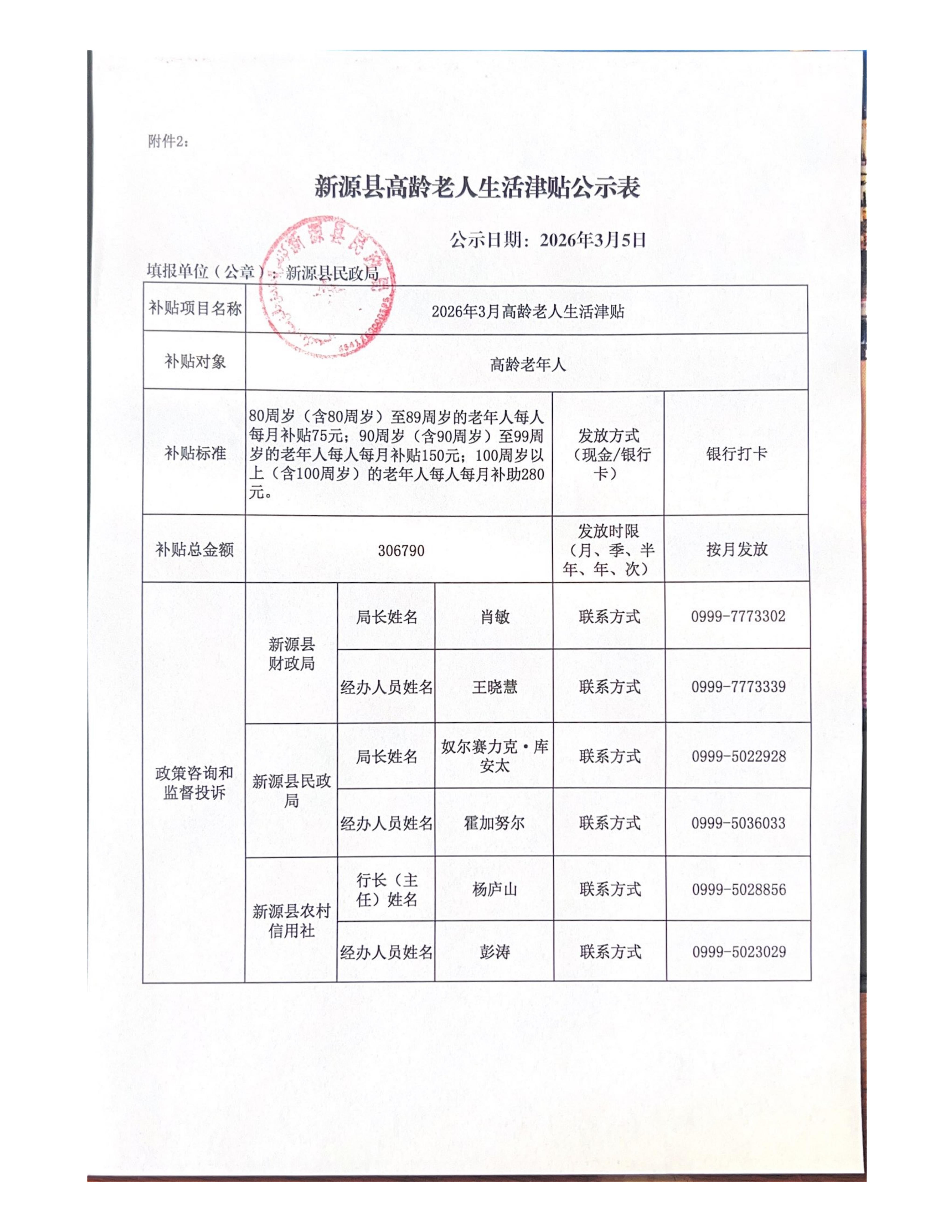 新源县2026年3月份高龄老人生活津贴发放总金额已核实,现在进行公示。
