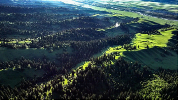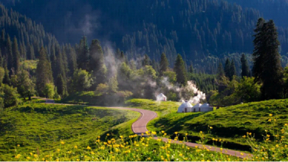 这里汇聚一山四景:白雪山峰、茂密森林、连绵起伏的山丘、平坦草甸,构成草原垂直自然景观的窗口。