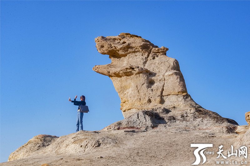 4月2日,网络视频达人在克拉玛依西部戈壁公园录制视频,推介当地旅游资源。 田国建摄