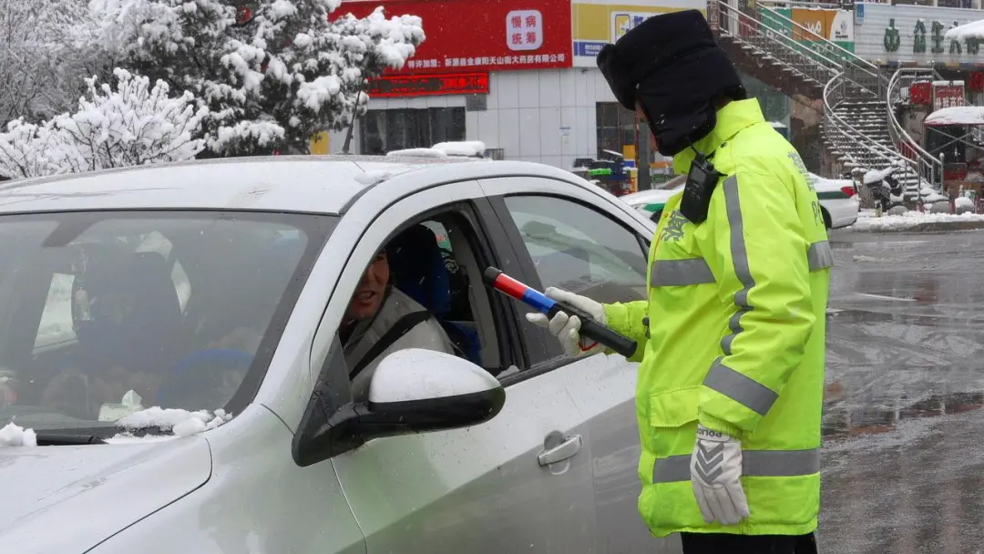 2月27日,在新源县恰普河路等主干道,漫天飞雪持续飘落,但路面已被清扫干净,车辆行人通行顺畅,沿街商铺正常营业,群众生活秩序井然。为保障道路交通安全,新源县公安局交通管理大队全员上岗,在重点路段、路口开展交通疏导、隐患排查,同时加大巡查和酒驾醉驾整治力度,全力守护雪天出行安全。