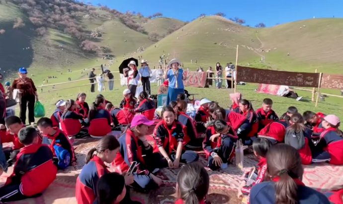 下午6时许,那拉提杏花谷内杏花如雪,芬芳四溢。来自新源县兴钢镇中心小学的师生们在杏花谷的山坡上席地而坐,以蓝天白云为幕布,以青青草地为课堂,开启了一场独特的非遗扎染研学之旅。作为本次活动的特邀研学导师,来自新疆大学纺织与服装学院的信晓瑜教授带领其课题组两名研究生共同指导了本次非遗体验活动。信晓瑜教授是自治区社科普及人才,深耕丝绸之路纺织非遗研究多年,在传统染织服饰文化社科普及领域具有丰富经验。她带领孩子们亲手触摸千年扎染技艺的温度,感受中华优秀传统文化的深厚底蕴。“传承文化,温润心灵,以手养心,以美育人”这十六字活动宗旨,在我院社科普及团队的专业引领与温情讲述中得到了生动诠释。