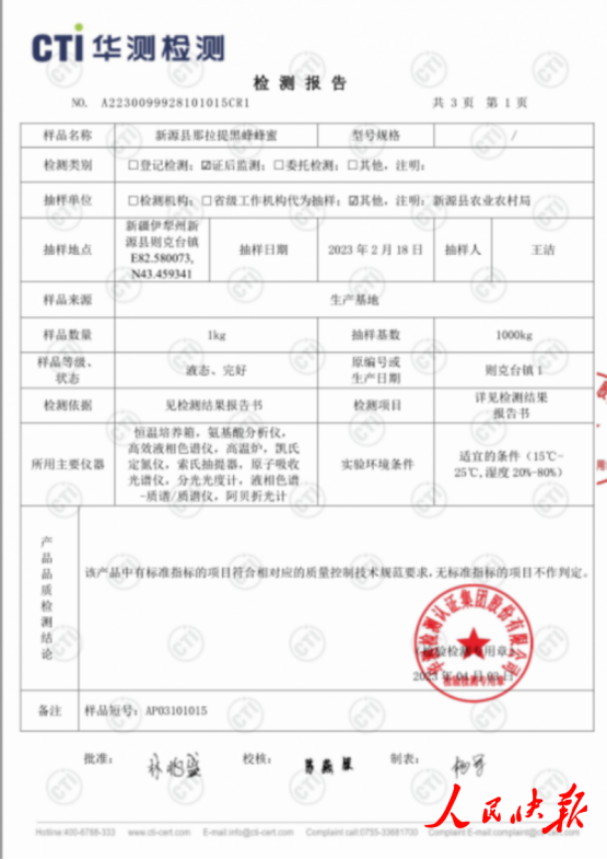 在新源县蜂蜜保护范围内的11个乡镇抽取22批次样本,送往深圳华测检测认证集团股份有限公司,进行质量安全检测及特色营养品质检测,明确那拉提黑蜂蜂蜜品质标准及产品优势,为地标品牌宣传提供官方数据支撑。