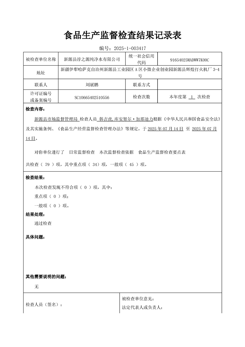 新源县淳之源纯净水有限公司食品生产监督检查结果记录表7月14日