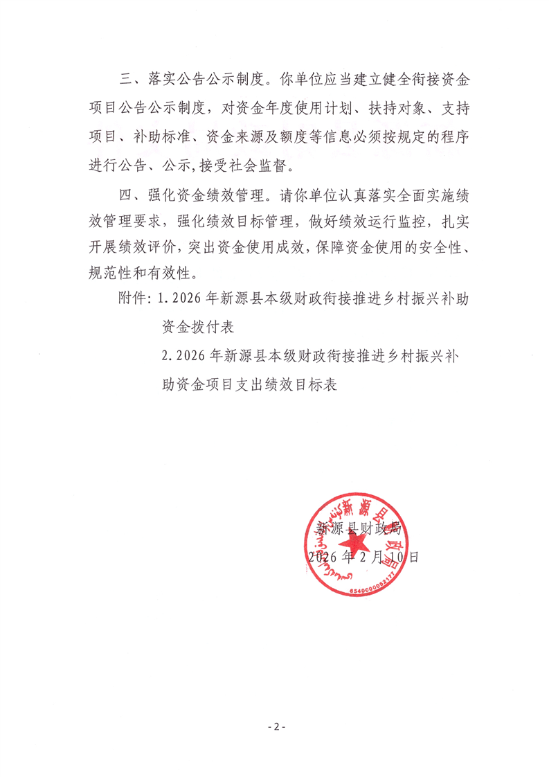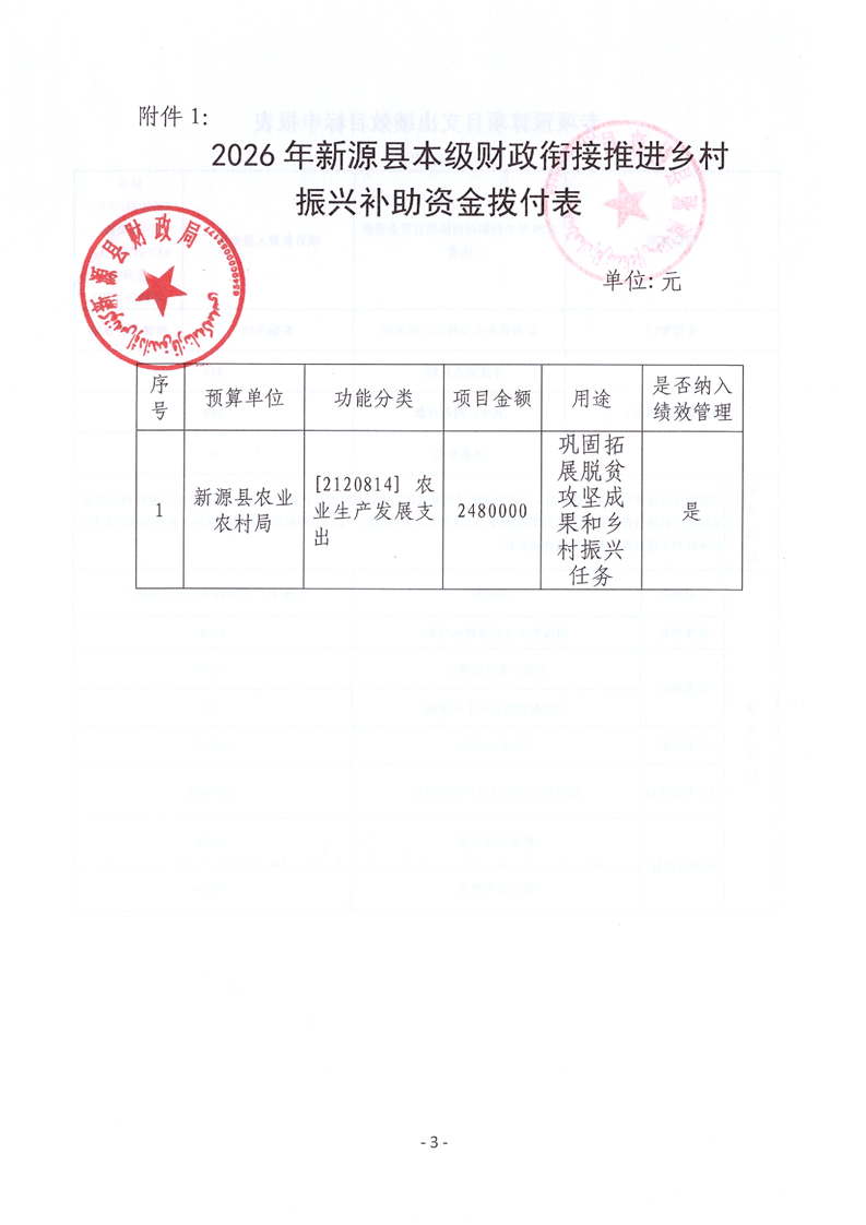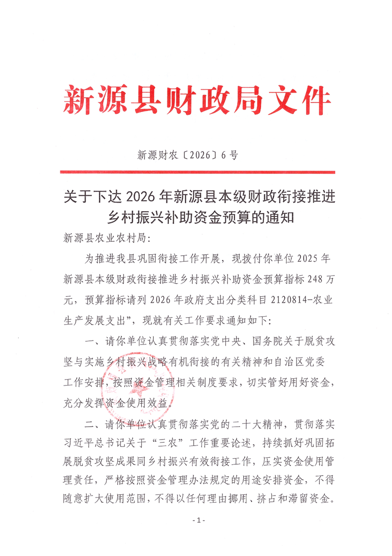 关于拨付2026年新源县级配套财政衔接推进乡村振兴补助资金预算的通知